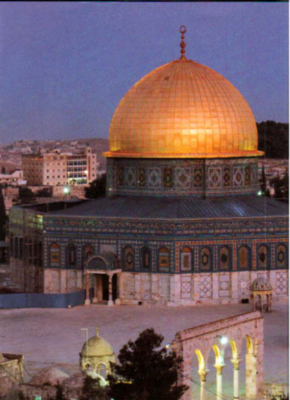 القنطرة الشمالية الغربية مضاءة وإلى يسارها قبة الأرواح وفي الخلفية قبة الصخرة