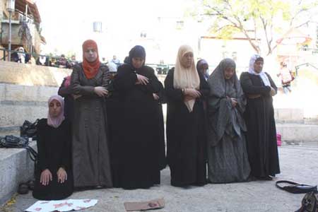((مرابطات يؤدين الصلاة أمام أبواب الأقصى بعد منعن من دخوله))